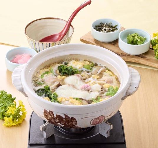 真鯛、釜揚げしらすと菜の花の旨みを楽しめる、やさしい味わいの雑炊です。春らしい彩りで、心温まる一品に仕上げました。