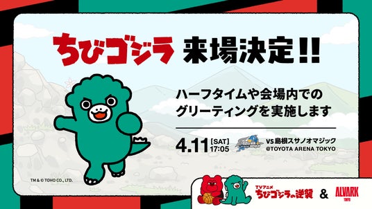 本コラボレーションは、2026年4月11日(土) 島根スサノオマジック戦に開催するホームゲームイベント「ALVARK FAMILY DAY」の一環として実施。当日はちびゴジラが来場し、会場内でのグリーティングや、ハーフタイムショーに登場予定です。
