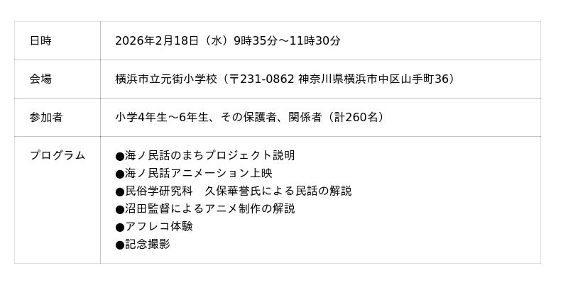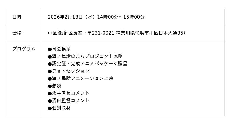一般社団法人日本昔ばなし協会が取り組む「海ノ民話のまちプロジェクト」は、2026年2月18日(水)に神奈川県横浜市中区を舞台にした海ノ民話アニメーション「赤い靴」が完成したため、アニメ監督が横浜市中区を訪問しアニメのお披露目と「海ノ民話のまち」認定式を実施しました。また、同日午前には地元の元街小学校にて同作品の上映会を開催しました。