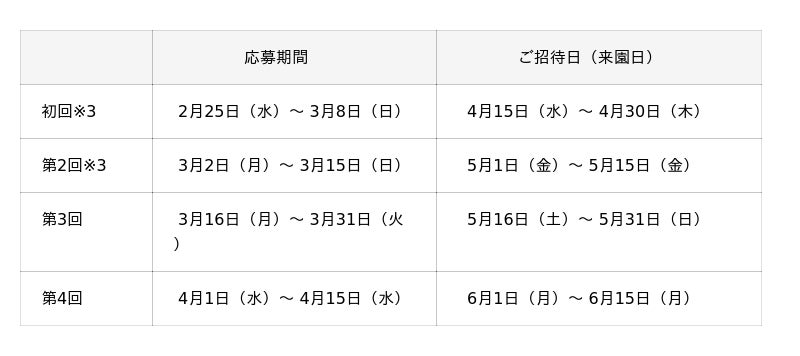 ※5 同一の応募月において重複して当選することはありません。初回ご来園分のみ応募受付期間が2026年2月25日~3月8日に