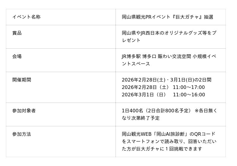 岡山県観光PRイベントがJR博多駅博多口賑わい交流空間で開催『巨大ガチャ』抽選に高さ2.0mの「モンスターカプセル」が登場!2026年2月28日(土)・3月1日(日)2日間開催