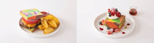 ワンダリアカフェでは、施設のロゴの色合いを表現した色鮮やかな「ワンダリアブレッド」を使用した「ワンダリアハンバーガー(税込1,580円)」や、「ワンダリアフレンチトースト(税込1,580円)」など、視覚的にも味覚的にも楽しめるメニューを提供します。また、「ゾーン2:ダイブ・トゥ・ブルー」と連動した「ディープ・ブルーピザ(税込1,580円)」の他、各ゾーンの体験と連動したオリジナルドリンクなども開発しました。「ワンダリアブレッド(税込680円)」はテイクアウト限定商品として販売し、「ワンダリアドーナツ(税込480円)」とともにテイクアウト可能です。