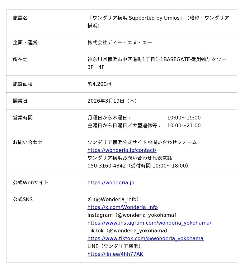 株式会社ディー・エヌ・エー(本社:東京都渋谷区、代表取締役社長兼CEO:岡村信悟、以下 DeNA)は、2026年3月19日(木)に大規模複合街区「BASEGATE横浜関内」にて開業する没入型体験施設「ワンダリア横浜 Supported by Umios」(以下、ワンダリア横浜)について、公式アプリ「ワンダリアアプリ」の体験詳細をお知らせします。また、横浜発ギフトスイーツブランド『横浜バニラ』を展開する、横浜バニラ株式会社(本社:神奈川県横浜市、代表取締役社長CEO:高橋優斗、以下 横浜バニラ)とワンダリアショップのコラボ商品の開発が決定しました。さらに、ワンダリアカフェとワンダリアショップにおいて取り扱う商品の情報や、施設に登場する生き物のイラストを手がけるクリーチャーデザイナー「山村れぇ」氏の参画に関する情報を公開しました。
