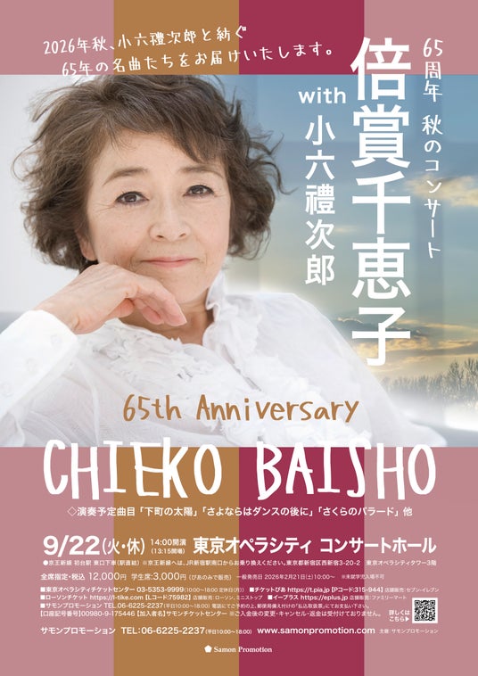 俳優として、また歌手として長年にわたり愛されてきた 倍賞千恵子の歌声と、小六禮次郎によるピアノが響き合う、65周年の節目にふさわしいコンサートとなります。