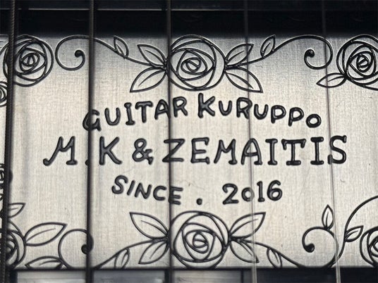 ●2つのピックアップの間には、「GUITAR KURUPPO M.K & ZEMAITIS SINCE.2016」の文字が彫金されている