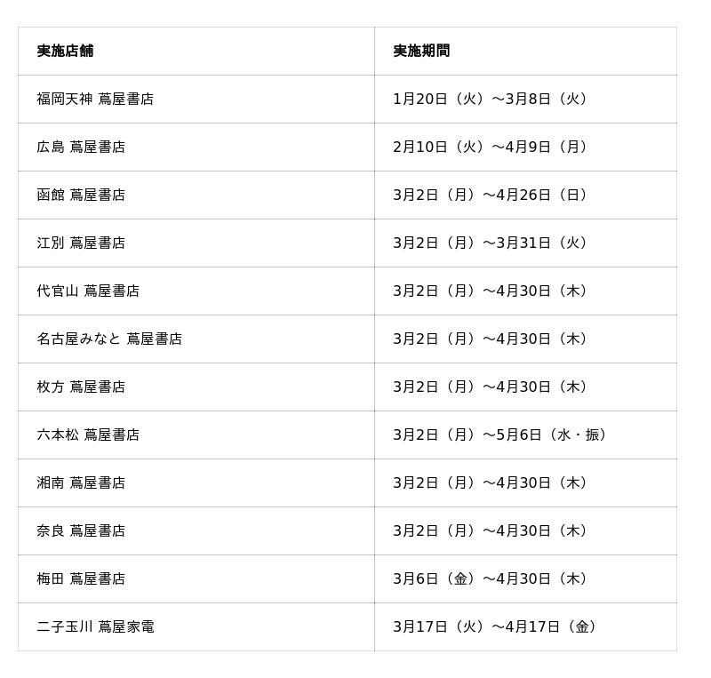 全国の書店員が『日本一面白い書店フェア』を競い合う前代未聞の出版業界横断プロジェクト「OVOL 日本紙パルプ商事 presents Book Fair Championship(以下、BFC)」にて、広島 蔦屋書店(広島県広島市)の文学コンシェルジュ・江藤宏樹、藤原さゆりが企画した「ペア読」フェアが第2回大会のチャンピオンに選ばれたことを記念し、2026年3月2日(月)から順次、全国の蔦屋書店(一部店舗を除く)で「ペア読」フェアを拡大展開いたします。
