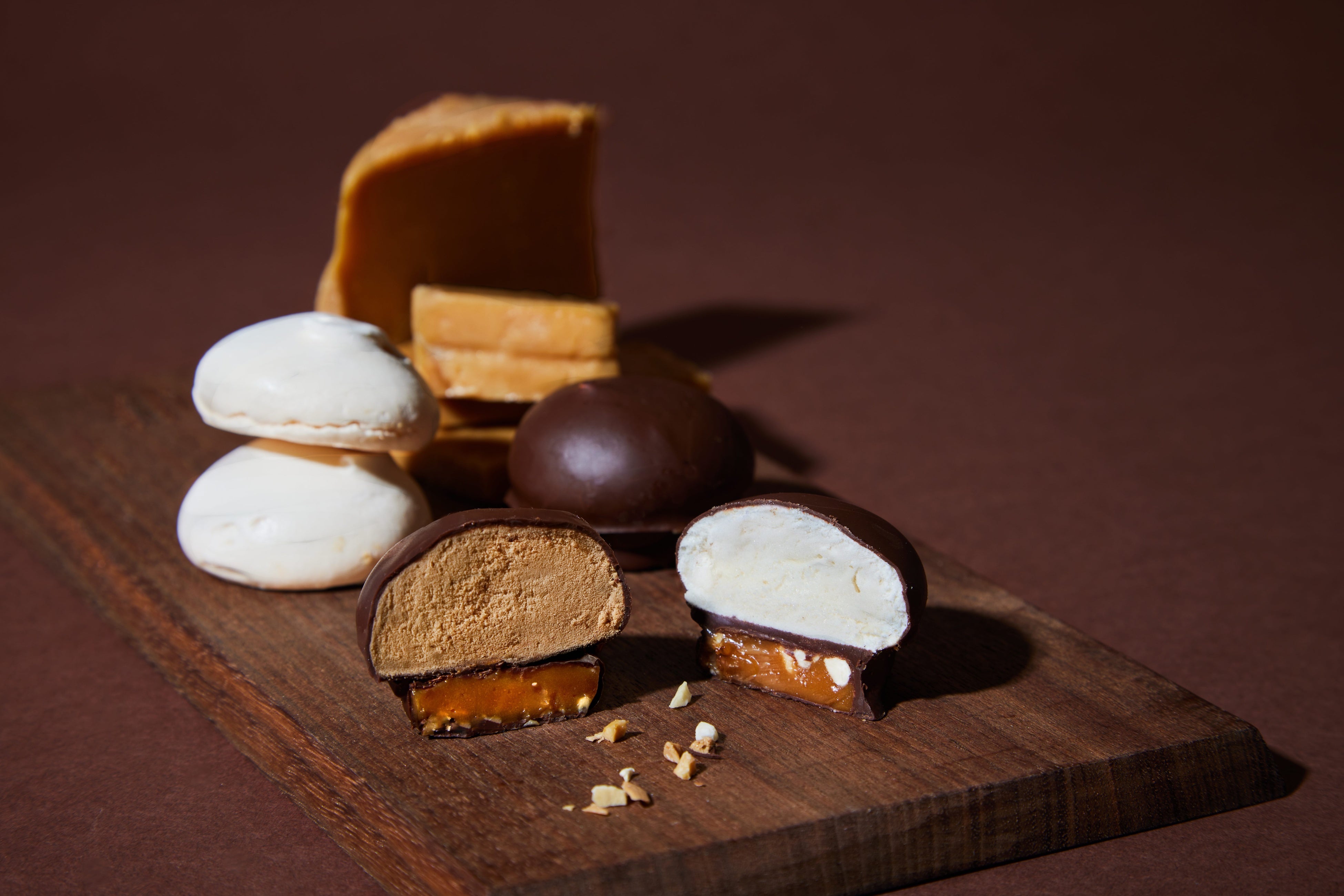 キャラメルとチーズの間に生まれた奇跡。ほのかに甘酸っぱさと塩味、そして濃厚さを合わせた複雑な味わいのブラウンチーズ。そのブラウンチーズと、ふわっと軽やかなメレンゲ、その周りを包みこむなめらかなチョコレート。まったく異なる素材が重なりながら、口に入れた瞬間、3つのとろけるがひとつに。