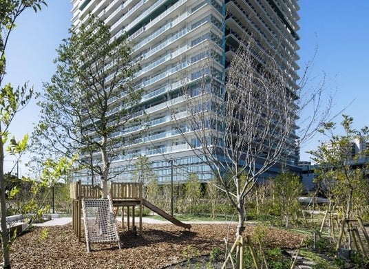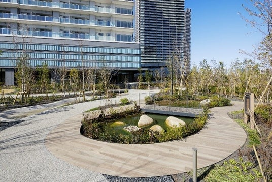外構は「里街(さとまち)」をコンセプトに、子供から大人まで集えるシンボルツリーとツリーデッキ、生き物の生態系を学べるビオガーデン等を設け、入居後には居住者向けに植物観察会や巣箱づくり等のイベントを計画しています。本物件では敷地内における生物多様性保全の取り組みが評価され、「いきもの共生事業所(R)認証(ABINC認証)」を取得しています。