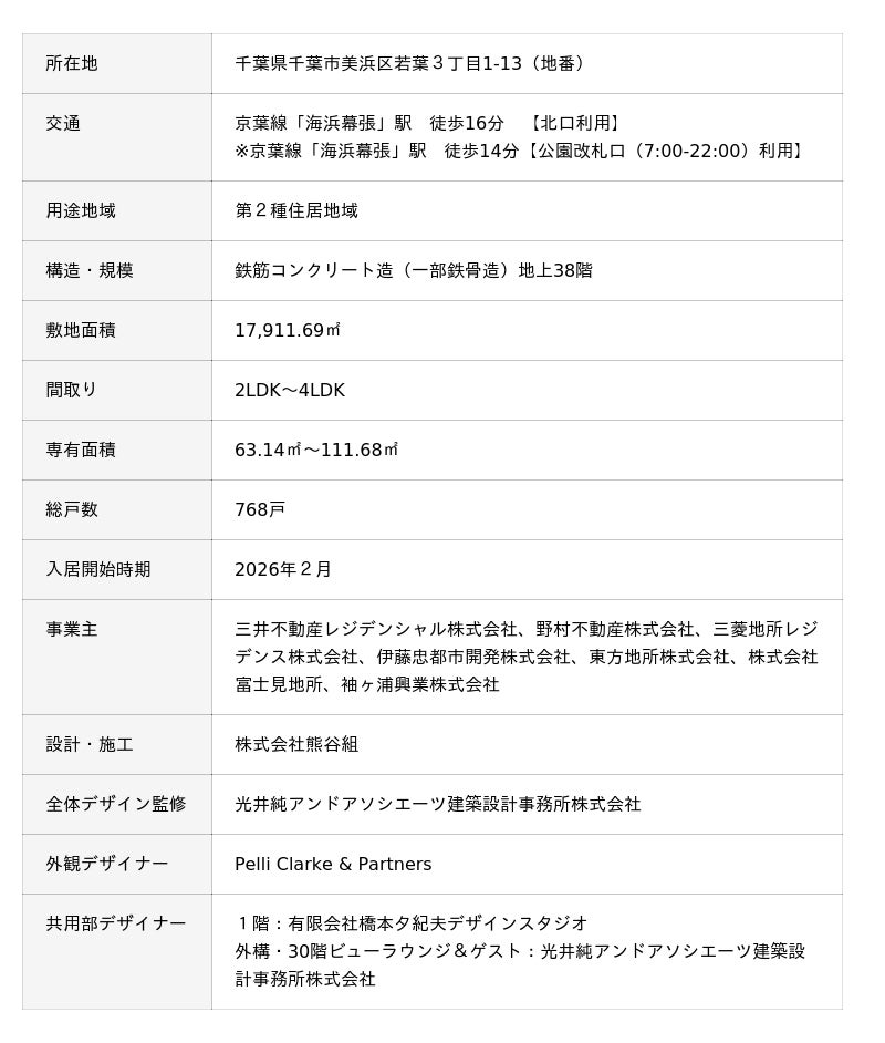 三井不動産レジデンシャル株式会社(本社:東京都中央区、代表取締役社長:嘉村 徹)は、「幕張新都心若葉住宅地区」(以下、幕張ベイパーク)において、他6社と共に推進する分譲住宅事業『幕張ベイパーク ライズゲートタワー』(以下、「本物件」)が2026年2月24日に竣工し、2月25日よりお客さまへのお引渡しを開始したことをお知らせします。