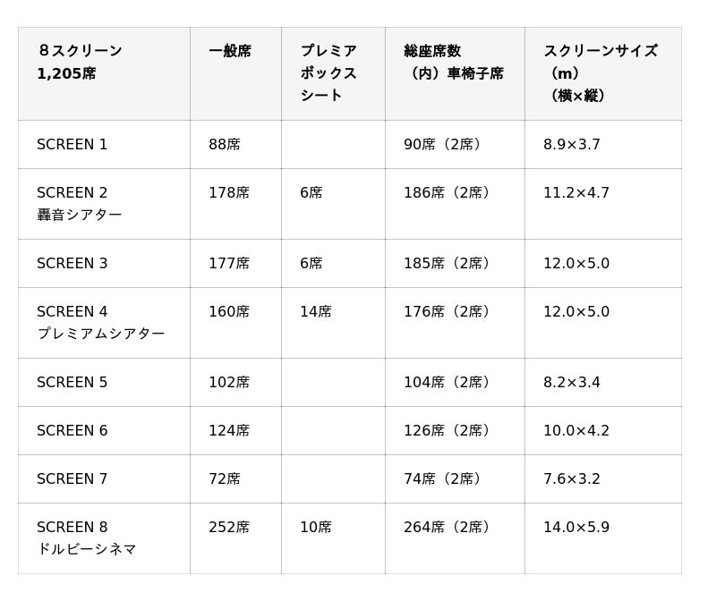 さらに、全8スクリーンのうち4スクリーンには、座席と座席の間に仕切りを設けることでプライベート空間を創出し、映画への没入感を高める「プレミアボックス シート(R)」を採用しました。長時間の鑑賞でも疲れやストレスを感じにくいレザーシートに、重厚感のある木目調の肘掛、ドリンクホルダー、荷物置きスペースまでを備え、いつもより少し贅沢な鑑賞体験を提供してまいります。