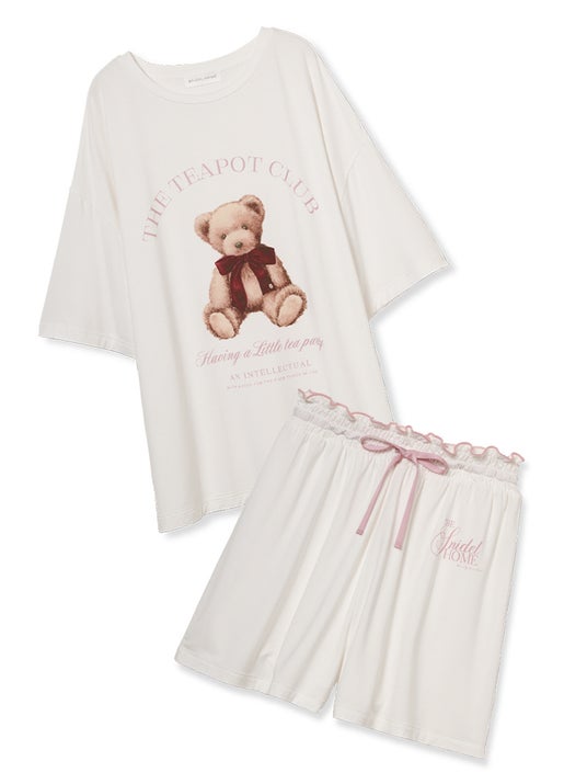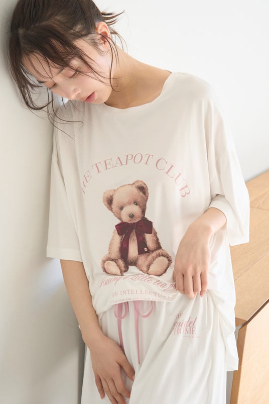 接触冷感加工を施したレーヨンカットソーを使用したベアモチーフのセットアイテムがオープン限定アイテムとして登場。トップスは、ゆったりとしたネックラインとドロップショルダーが特徴のオーバーサイズTシャツ。フロントには、リボンを纏ったベアとアーチロゴをあしらいました。