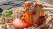 茹で上がり後に水で締めてご提供するうどんは、弾力あるもちもち感が特徴。食べ応えある豚肉や食欲そそる特製甘辛醤油ダレともよく合います。うどんは温・冷から選ぶことができるので、その日の気分に合わせてお召し上がりいただけます。