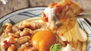 だしで煮詰めたぜんまいやわらびなどの山菜をたっぷりとのせた一杯。食感も楽しく、山菜の香りが広がるやさしい味わいのかけだしを、打ち立てのうどんに絡めてどうぞ。