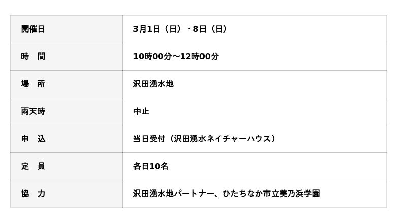 国営ひたち海浜公園の「沢田湧水地」では、3月1日(日)・8日(日)に「ニホンアカガエルの卵をさがそう」を開催します。多様な動植物が生息する“生き物の宝庫”である沢田湧水地で、公園ボランティアの案内のもと、池や水田を観察しながら、寒い時期に産卵するニホンアカガエルの卵を探します。春が近づくにつれ増えていく卵の数や、水中を元気に泳ぐオタマジャクシの姿を観察しながら、自然の営みと春の訪れを感じてみませんか。