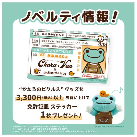 さらにお買い上げ特典として、会場にて販売予定の「Chara★Van×かえるのピクルス」の商品を税込3,300円以上お買い上げで「免許証風ステッカー」を1点プレゼントいたします。