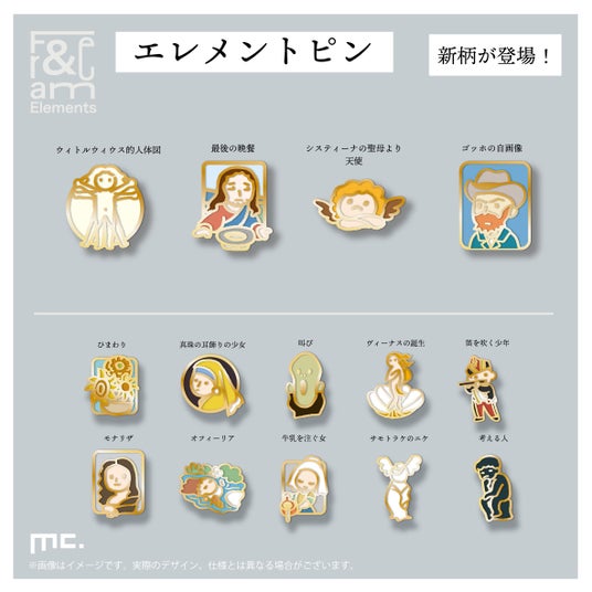 お気に入りの要素=エレメントをモチーフ化したピンバッジです。お気に入りの絵、力をもらえる絵、何だか気になってしまう絵…それはすべて自分を形作るエレメンツ。額に飾ればあなただけの美術館に!