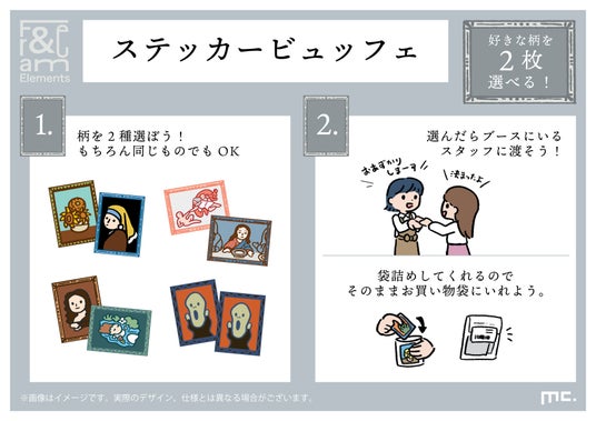 毎回売り切れが発生する人気のアイテム!名画のイラストを使用した、全16種類のステッカーです。フレームトートバッグの窓に入れたり、ノートやスマホに貼るなど楽しみ方色々。お好きな2枚を選んでお買い求めいただけます。