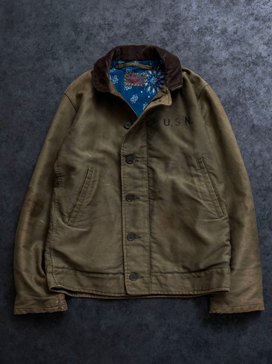 N-1デッキジャケットは、1940年代から1960年代にかけてアメリカ海軍で採用されていた防寒用ミリタリージャケットです。今回RH Vintageでは、裏地をヴィンテージバンダナに置き換えるカスタムを施し、修繕や再構築を重ねながら、解体から仕上げまで丁寧に手間をかけた特別な一着に仕上げています。