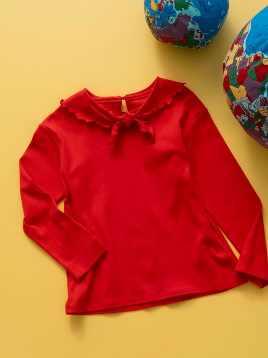 定番の2way リボントップスを神戸店限定カラーのレッドで別注しました。セーラーのような印象の襟は、2way で楽しんでいただける仕様に。フリルを施した襟は、結ぶとミニリボンにでき1枚で表情を変えられるアイテムです。袖はフル丈~7分袖と成長しても長くご愛用いただけます。職人が一枚一枚丁寧に縫製した愛に溢れた逸品は華やかな印象に仕上げました。