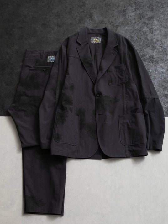 スノーカモジャケットとイージーパンツはブラックのオーバーダイを施し、一枚の布状にしたデッドストックのスノーカモポンチョを使用しています。廃棄問題の解決に取り組む、デジタル技術を研究・開発する企業シンフラックスによる「Algorithmic Couture(R)(アルゴリズミック・クチュール)」の技術を活用し、限られた生地を最大限に生かす型紙を導き出しました。