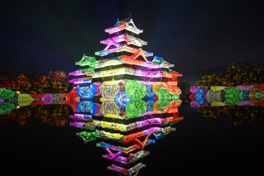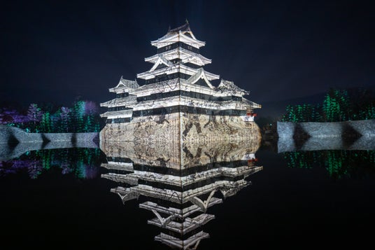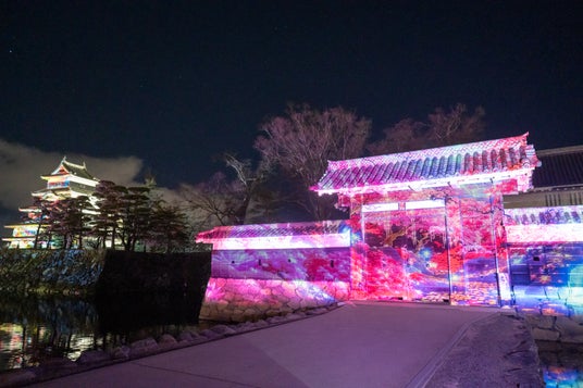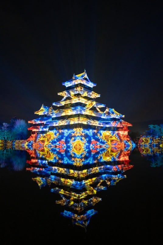 現存国宝5天守の一つで五重六階の天守の中で最古の国宝 松本城の天守や石垣へのプロジェクションマッピング。園路でのインタラクティブコンテンツや城門でのプロジェクションマッピング、園内のライトアップも。