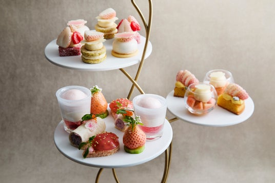 象徴的な「ツリーハウス」を擁する30階の「JWラウンジ」では、可憐な淡い色合いが春の訪れを告げる、白苺と桜を主役にした限定アフタヌーンティーをご提供いたします。
