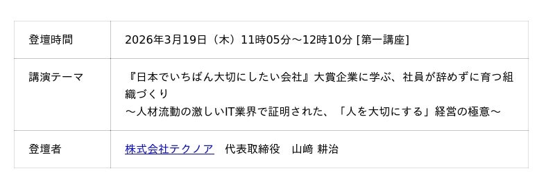 当日は「社員が辞めずに育つ組織づくり」をテーマに、テクノアが「人を大切にする経営」に至った背景から、社員が自律的に働く組織へと変革したプロセス、定着・育成の実践ポイントまでを事例を交えてお話しします。採用や育成に課題をお持ちの経営者の皆さまと共に、これからの組織のあり方を考える機会となれば幸いです。