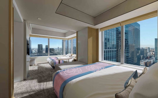 やわらかな日本の伝統色を生かした温かみのある客室は、くつろぎのひとときを演出します。窓外に広がる景色は昼夜で表情を変え、高層ビル群と電車の往来が織りなす躍動的な眺望は、思わず息を飲むほどの美しさです。