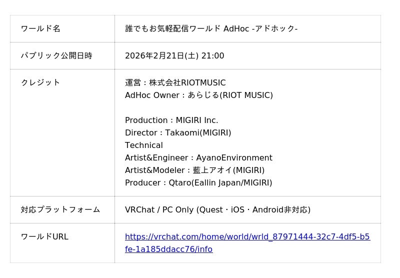 ワールド「誰でもお気軽配信ワールド AdHoc -アドホック-」概要