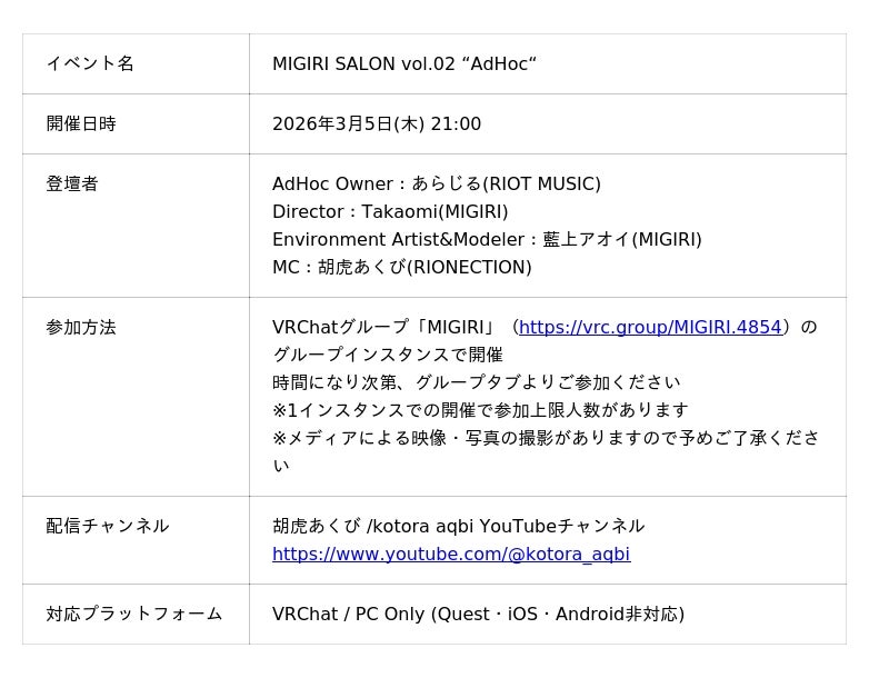 RIOT MUSICによるVRChatワールド「誰でもお気軽配信ワールド AdHoc -アドホック-」(以下、AdHoc)がパブリック公開となりました。同ワールドの企画・制作をクリエイティブスタジオMIGIRIが担当しています。