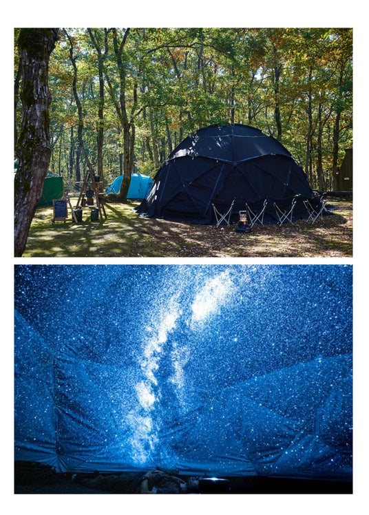 ■昼間に見る、満天の星アウトドアの象徴、テントの中で広がる満天の星空。春の日差しの下、特別なプラネタリウム体験をお届け。ゆったり寝転がりながら、宇宙の神秘に触れる贅沢なひととき。