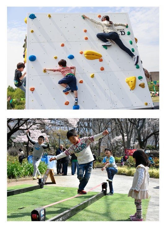 ■跳ねて、登って、バランスとって春の外遊びは、体を動かすことから。トランポリンの浮遊感、ボルダリングの達成感、スラックラインのスリル。初心者でも気軽に参加できる、春だけの特別アクティビティ!