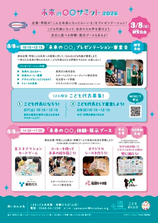 企業や学校が「こんな未来になったらいいな」というアイデアや現在の取り組みをプレゼンテーションします。公募で選ばれた小学3年生から中学3年生までの未来の大人である「こども代表」12人がその内容を審査する、こども主役のサミットです 。