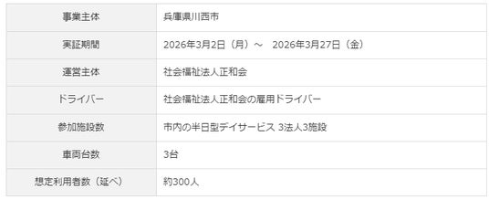 川西市が事業主体となり、2026年3月2日(月)から2026年3月27日(金)まで実施され、運営は一日型デイサービスを提供する社会福祉法人正和会が主体となり、同法人の雇用ドライバーが送迎を行います。ダイハツは運営体制構築や運行支援など、実証実験全体の推進を支援します。市内の半日型デイサービス3法人3施設が参加し、3台の車両で昼間の送迎を行い、延べ約300人の送迎を予定しています。実証実験により、各地域の課題に即した共同送迎サービスの有効性を検証し、運営体制や事業成立性の評価を行うことで、今後のサービス正式運行へ向けた検討を進めていきます。