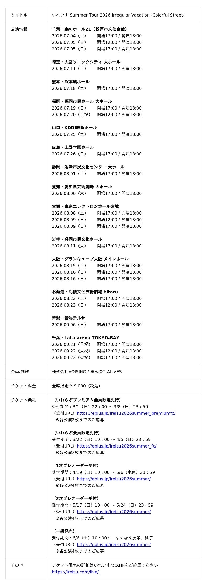 そしてこの夏に先駆け、公式ファンクラブ「いれらぶ」リニューアル後、初となるファンクラブイベントの開催が決定いたしました。本イベントは、フェニーチェ堺にて2026年4月25日(土)、パシフィコ横浜 国立大ホールにて2026年5月3日(日)に開催され、各日2公演を予定しております。