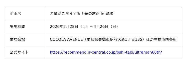 2026年2月28日(土)から4月26日(日)にかけて、愛知県豊橋市が"ウルトラマンの街"へと変わります。東海旅客鉄道株式会社(JR東海)、豊橋市、株式会社JTBコミュニケーションデザインの3者が連携したコラボ企画「JR東海×『ウルトラマンシリーズ』60周年特別企画 ~希望がこだまする!光の旅路 in 豊橋~」がいよいよ始まりました。