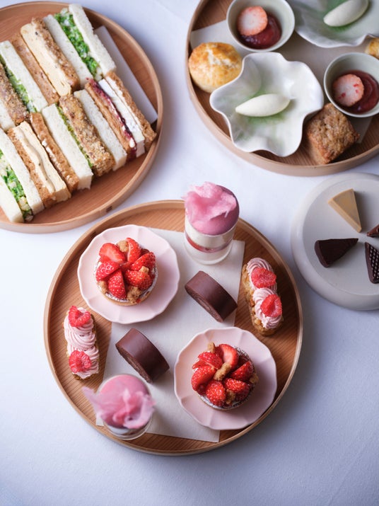 セイボリーには、海老と菜の花をマヨネーズソースで和えた春らしい一品や、原了郭の七味を効かせただし巻き玉子、マッシュルームカツと菜の花のサラダ、苺とラズベリーのジャムを添えたブリー・ド・モーチーズなど、和と洋が穏やかに調和する味わいを揃えました。スコーンは、プレーンとスパイスの2 種類をご用意し、クロテッドクリームと、ピンクペッパーの爽やかな辛味を加えた苺ジャムとともにお楽しみいただけます。