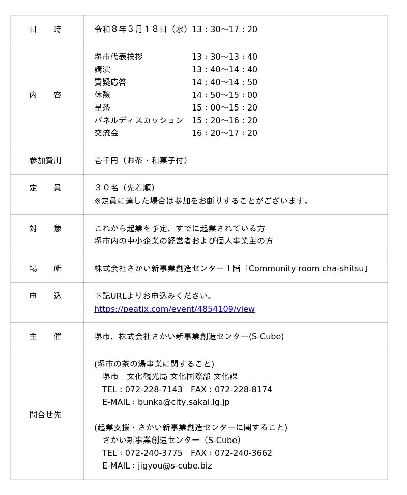 茶の湯の文化が息づく堺にて茶の湯が持つ本質的な価値を、現代の経営や組織づくりと結びつけて深く考える講演会を開催します。