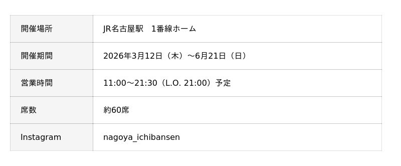 ジェイアール東海フードサービス株式会社(本社:愛知県名古屋市、代表取締役社長:岩下賢一)は、東京・新宿を拠点に国内外で高い評価を受けるラーメングループ「五之神製作所」と協力し、2026年3月12日(木)から6月21日(日)までの約3か月間、名古屋駅1番線ホーム(通称:幻の1番線)にて、台湾夜市をテーマにした期間限定イベントを開催いたします。