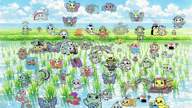 今回は"こどもたちと農林水産業"というイベントテーマに合わせ、AIぬりえを特別にカスタマイズしました。「かかし」「農具」「ザリガニ」といった農地や里山にかかわることばカードを用意しました。画面には9枚のことばカードがイラスト付きでランダムに表示され、こどもたちが1枚選ぶと次の9枚が現れ、合計3枚を選ぶとぬりえの生成が始まります。2パターンのぬりえが生成され、好きな方を選んで塗ることができます。さらに、できあがったぬりえをタブレット上でタッチペンや指で着色できるようにし、完成した絵を「キャンバス」に見立てた大型ディスプレイに映し出す方式にしました。キャンバスにはあらかじめ水田の風景が映し出され、そこに、こどもたちが完成させた世界唯一のぬりえが現れ、田んぼの風景の中に現れ、まるで自分の絵の中に入り込んだような体験ができます。こうしたテーマに合わせたカスタマイズは簡易に行うことができ、さまざまなイベントや企業との連携に対応可能です。