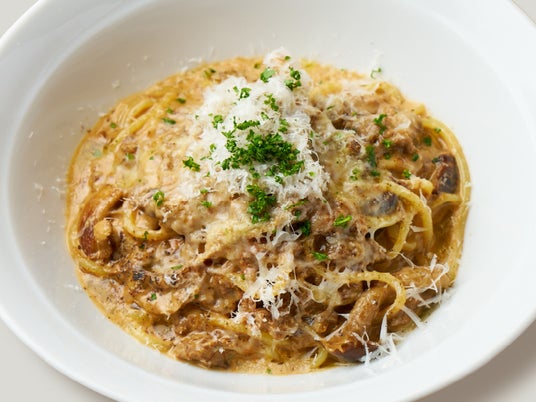 ポルチーニがふわっと香る、ミートソースと生クリームを絶妙な配合で合わせた根強い人気の濃厚クリームミートソースパスタ。