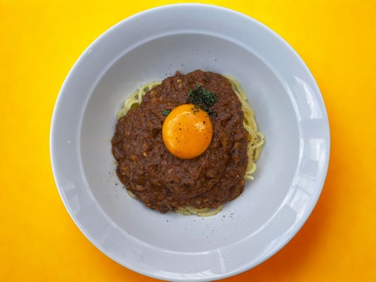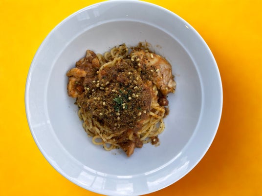 クミンやカルダモンなど自家挽きスパイスをたっぷりとまぶしたチキンがごろっと乗った、ボリューム満点ミートソースパスタ。