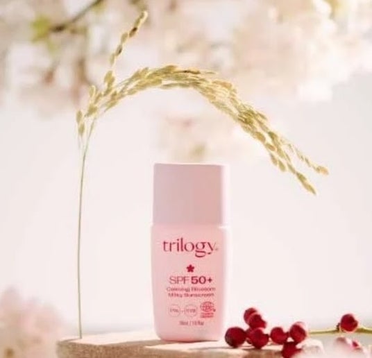 「トリロジー」カーミングブロッサム UVミルク 3,080円 ローズヒップオイル×SAKURICE配合。シミを防ぎ透明感を与える多機能美容液UV。CICAやバクチオール配合で潤いとハリを守り、SPF50+/PA++++で美容液・下地・トーンアップ・UVが1本に。◎8階「コスメキッチン」