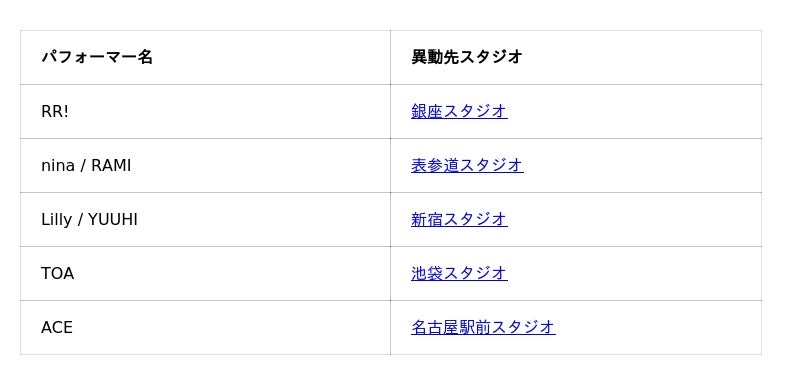 恵比寿スタジオに所属していたパフォーマーは、2月19日以降、銀座・表参道・新宿・池袋・名古屋駅前の各スタジオへ順次異動し、引き続きプログラムを担当いたします。異動先のスタジオは以下の通りです。