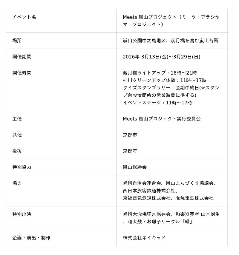 株式会社ネイキッド(英語表記:NAKED, INC. 、所在地:東京都渋谷区、代表:村松亮太郎)は、京都・嵐山において、マスツーリズム対策を見据えた持続可能な観光の仕組みづくりとして、観光・環境・文化をつなぐ体験型プロジェクト「Meets 嵐山プロジェクト」を始動します。2026年3月13日(金)~3月29日(日)に、渡月橋ライトアップをはじめとする施策を実施します。
