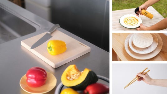 ▲長生きする、まな板(左)、wash_U(右上)、循環皿(右中)、いちょうのお箸(右下)