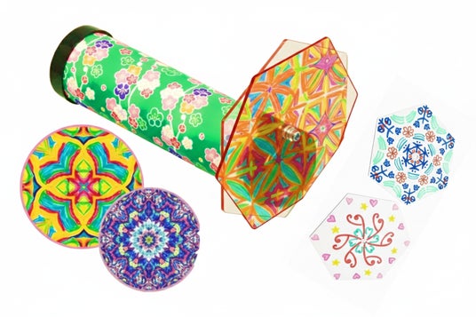 オリジナル万華鏡づくり色や形を自由に組み合わせて、世界にひとつだけの万華鏡をつくろう!2枚のプレートを入れ替えるだけで、くるくる変わる不思議な模様。のぞいた先にあなただけの模様が生まれます。