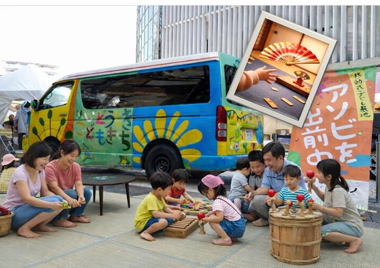 昔あそび大集合@移動式あそび場コマ・メンコ・けん玉・お手玉、竹コリントや積み木など、昔あそびが大集合。さらに、今回は、扇子を使った日本の伝統あそび「投扇興」にも挑戦できます。