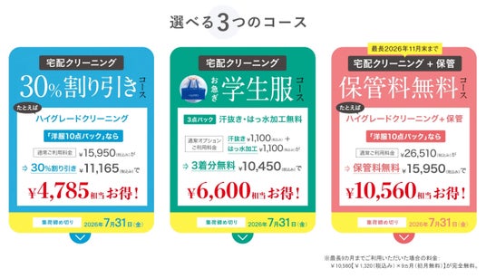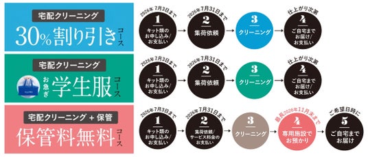 レギュラーサービスの30%割り引きでご利用いただけるコースと、11月末まで保管料無料で専用施設でお預かりするコースをご案内しています。昨年より新たに汗抜き・はっ水加工が無料のお急ぎ学生服コースもできました。集荷期限はいずれも2026年7月31日(金)まで。