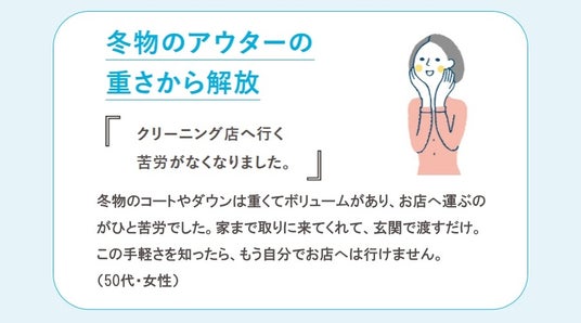 2010年のサービス開始以来「家まで取りに来て届けてくれるうえ、仕上がりもよいのでリピートしています」「きれいな状態で箱入りで届き、天地無用シールも貼られていて、洋服への愛情を感じました」「冬物のコートをクリーニング店に持って行くのは一苦労なので、利用しています。またお願いします」など、持ち運びが不要な点や仕上がりがうれしいなど、数多くの喜びの声をいただいており、リピート率80%の実績(昨年対比)となっています。